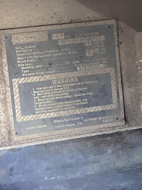 Century 19' 6"' Aluminum carrier with IRL Wheel lift. Full Mounting Frame. 8,000lb Ramsey Winch. 35" Cab Protector. Platform Consolidated Tilt & Full Length Mounting Frame Solid Tube Side Rails. Full-Length Nylatron Slide Pads. Front Chain Trays. Front and Rear Tie-Down Slots: Positive Bed Lock-Down System. Bed Anti-Tilt Feature. 8,000 lb. Hydraulic Winch with 50' of Cable IRL Wheel lift. w/ Slide-In L-Arms. Winch Clutch Release Winch Roller Guides. Winch Cable Tensioner Left & Right-Lighted Controls. Back-Up Lights. FMVSS 108 Lighting Back-Up Alarm. Safety Chains - 5/16, Grade 70. Hydraulic Pump Full Height Steel Headboard. Urethane-painted cab protector. Pre-Assembled and Factory Tested. Body Serial# 195C10A18876HC15