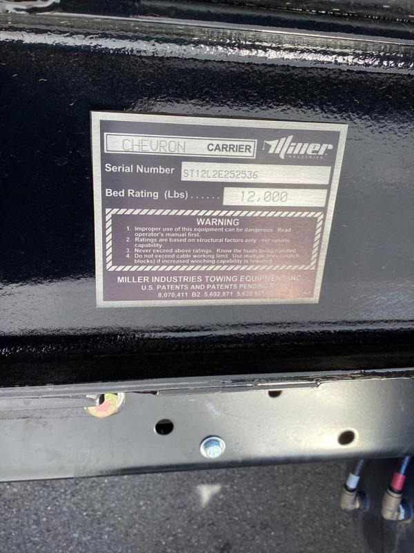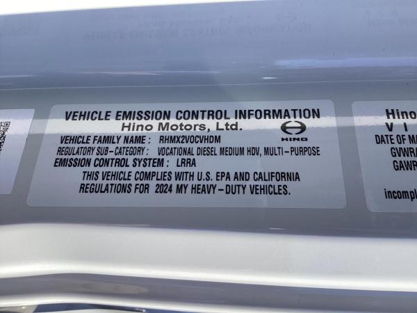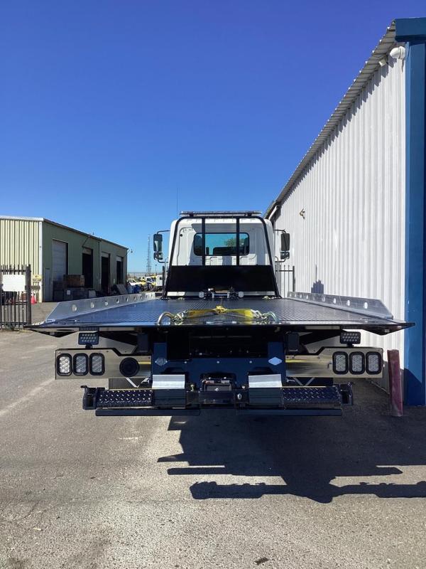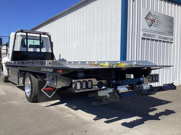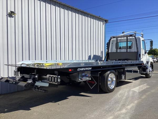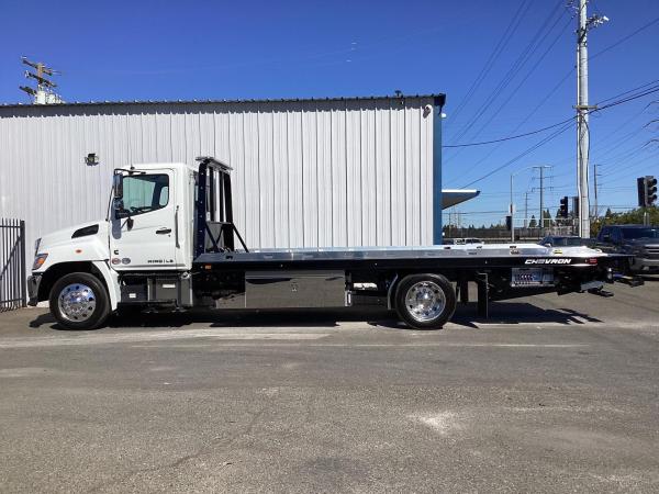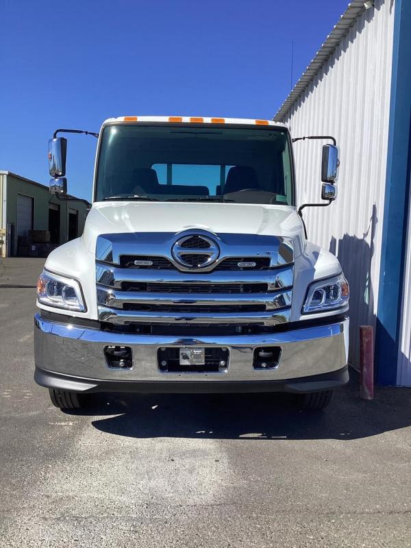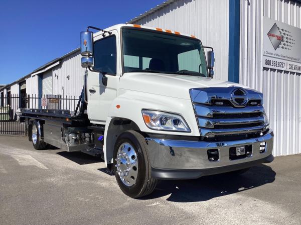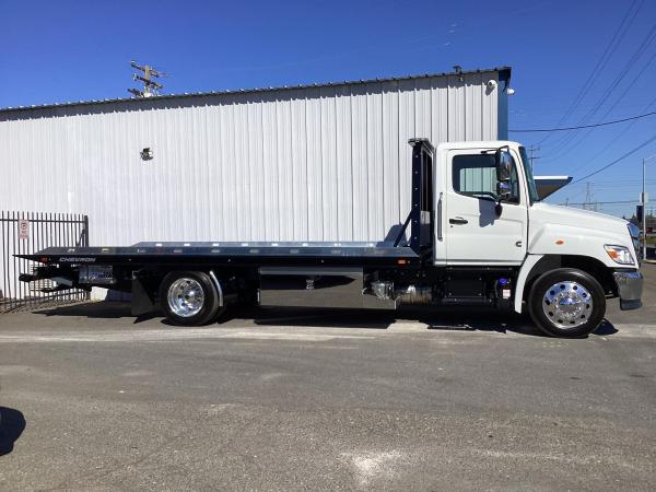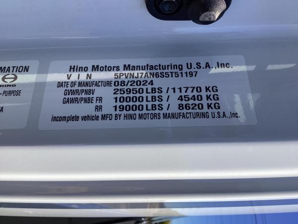 2025 Hino L-6 260 HP Auto. Allison Automatic. Exhaust Brake, Air Brake package. 10,000lb front Axle 12K Front Suspension. 19,000lb Rear Axle, 5.13 Ratio. 52 52-gallon aluminum tank. 19,000lb Air suspension. Power Group, AM/FM Bluetooth.. Air ride driver seat. Two-man Bench seat, cruise control, Idle up, chrome bumper -Aluminum wheels, Power Mirrors. Tilt wheel.. WB 22.5 25570R Tires. GVWR 25,950 149” CA ---- 5-year 300K Engine and After-treatment. 7-year unlimited -Allison WarrantyCentury LCG 12 21.5' Steel LCG (Low Center of Gravity) Carrier w/ Wheel Lift, 3/16 Deck Plate, 2x2 Corten Tube Crossmembers on 8 inch Centers, (4) Rear Chain Locks, (2) Front Chain Locks, (6) Floor Plate Chain Locks (3 per side), 8K Ramsey winch, 3/8" x 50' Winch Cable, Illuminated Dual Controls, FMVSS 108 Lamp Group Shock Mounted Lighted, Direct Mount Pump, Cable Roller Guide w/ Tensioner, Winch Free Spool Extension, Back-Up Alarm, (2) Safety Chains, Mechanical Anti-tilt, Black Body Paint, 102" Wide Body, Inboard Tilt Cylinders, Floor Level Roll Formed w/ Punched Stake Pockets, 4,000lb Wheel Lift w/ Releasable L Arms, Fully Hydraulic Wheel Lift, (2) Safety Straps & Ratchets, (2) Rear Safety Chains, Body Lock w/ Nylatron roller Bearings, & 12,000lb Deck Load Rating, Body Serial #