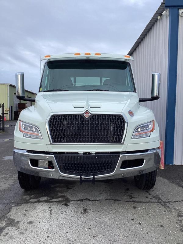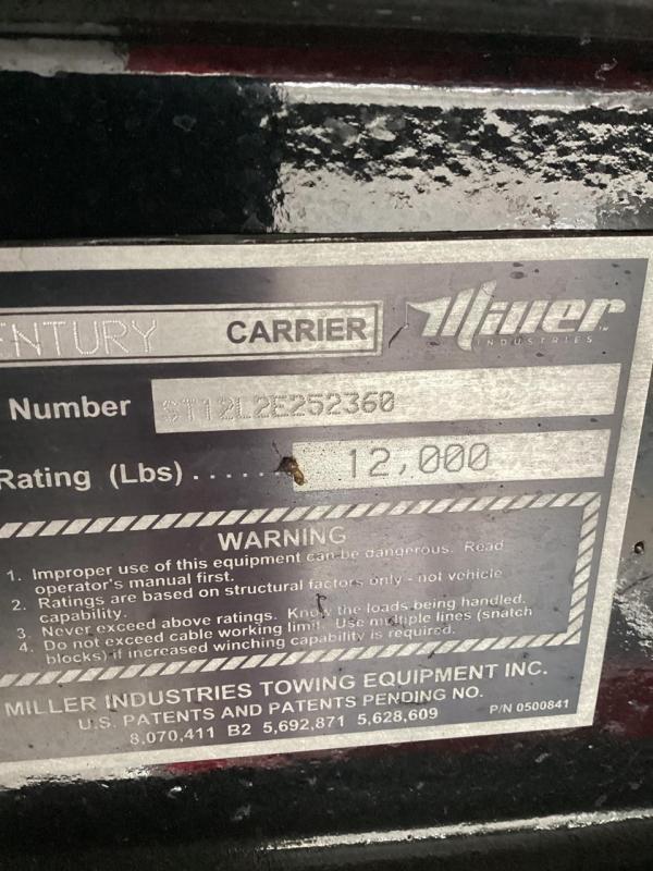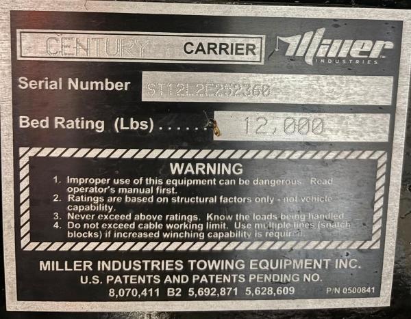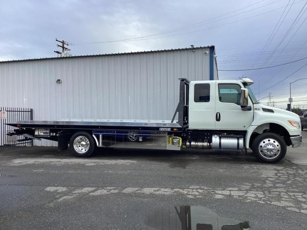 International Model MV Extended cab. Cummins ISB 6.7L, 260HP @ 2,300 rpm, 660 lb-ft @ 1,600 rpm, Allison RDS-2200 6 Speed Auto, Air Brakes, Air Dryer Heater, Exhaust Brake, Front Axle: Dana-Spicer I-Beam 8,000lb w/ Shock Absorbers, Rear Axle: Dana-Spicer 19,000lb rear differential lock. , 20,000lb Air Ride Suspension, 4.88 Rear Axle Ratio, Chrome Bumper, black Grille, Air Ride Driver Seat,& Passenger Seat, rear bench seat. Idle Up, Cruise Control, Tilt-Wheel, AM/FM/CD/MP3 w/ Bluetooth, Air Horn, Engine Block Heater, Dual 40-50 Gal Alum Fuel Tanks, 7 Gal DEF Tank, Power Windows, Power Door Locks, Power heated Mirrors. A/C, 255/70R22.5 Tires w/ 22.5 Alum Wheels, Cup holders.Visor 25,500 GVWR,Century Steel LCG (Low Center of Gravity) Carrier w/ Wheel Lift, 3/16 Deck Plate, 3x2 Corten Tube Crossmembers on 8 inch Centers, (4) Rear Chain Locks, (2) Front Chain Locks, (6) Floor Plate Chain Locks (3 per side), 8,000lb Worm Gear Winch, 3/8" x 50' Winch Cable, Illuminated Dual Controls, FMVSS 108 Lamp Group Shock Mounted Lighted, Direct Mount Pump, Cable Roller Guide w/ Tensioner, Winch Free Spool Extension, Back-Up Alarm, (2) Safety Chains, Mechanical Anti-tilt, Black Body Paint, 102" Wide Body, Inboard Tilt Cylinders, Floor Level Roll Formed w/ Punched Stake Pockets, 4,000lb Wheel Lift w/ Releasable L Arms, Fully Hydraulic Wheel Lift, (2) Safety Straps & Ratchets, (2) Rear Safety Chains, Body Lock w/ Nylatron Toller Bearings, & 12,000lb Deck Load Rating. Body SN# ST12L2E252360