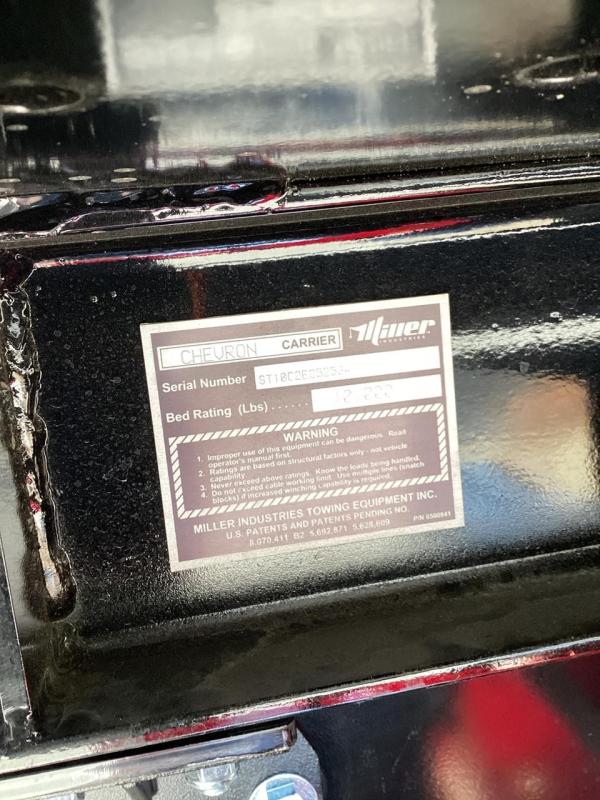 Chevron 21' Body Length steel carrier w/wheel lift w/ L-arms, full-length nyltron wear pads, (2) 3" lift cylinders, one extension cylinder, right and left chain trays, positive bed lock down system, 8,000# winch, winch roller guides, cable tensioner, left and right illuminated controls, back up lights, Federal standard 108 lighting, back up alarm, wheel lift safety pin, safety chains, 3000 psi operating system, 1080 square inches of slide pad, full length sub frame. LED Body lights. Body Serial # ST10C2E252533