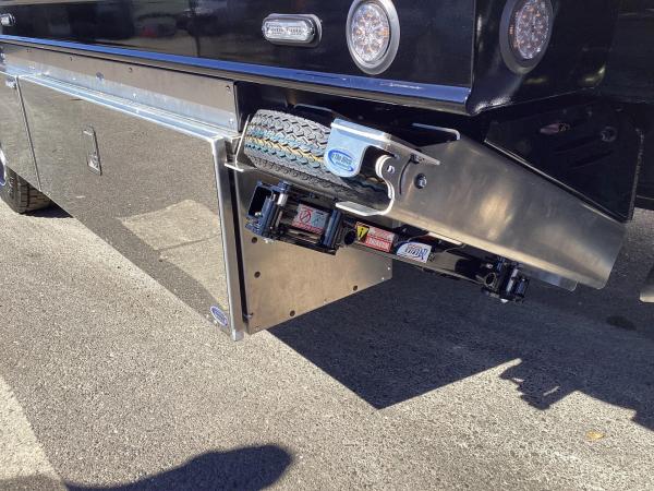 Chevron Steel LCG 16,000lb (Low Center of Gravity) Carrier w/ Wheel Lift, 3/16 Deck Plate, 3x2 Corten Tube Crossmembers on 8 inch Centers, (4) Rear Chain Locks, (2) Front Chain Locks, (6) Floor Plate Chain Locks (3 per side), 8,000lb Worm Gear Winch, 3/8" x 50' Winch Cable, Illuminated Dual Controls, FMVSS 108 Lamp Group Shock Mounted Lighted, Direct Mount Pump, Cable Roller Guide w/ Tensioner, Winch Free Spool Extension, Back-Up Alarm, (2) Safety Chains, Mechanical Anti-tilt, Black Body Paint, 102" Wide Body, Inboard Tilt Cylinders, Floor Level Roll Formed w/ Punched Stake Pockets, 4,000lb Wheel Lift w/ Releasable L Arms, Fully Hydraulic Wheel Lift, (2) Safety Straps & Ratchets, (2) Rear Safety Chains, Body Lock w/ Nylatron Toller Bearings, & 12,000lb Deck Load Rating. Body SN# ST16L2G224350