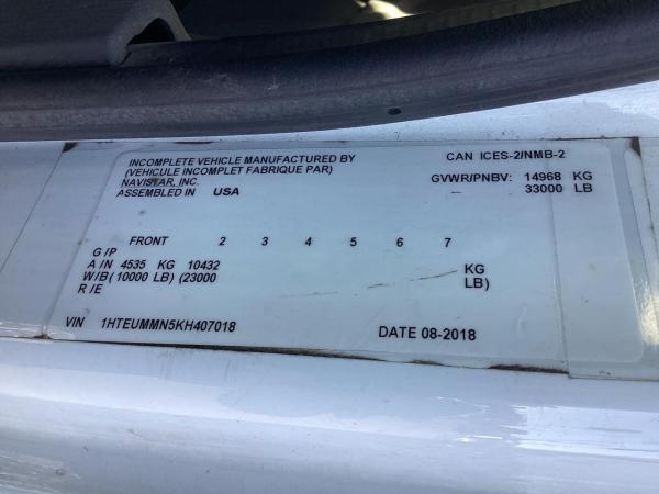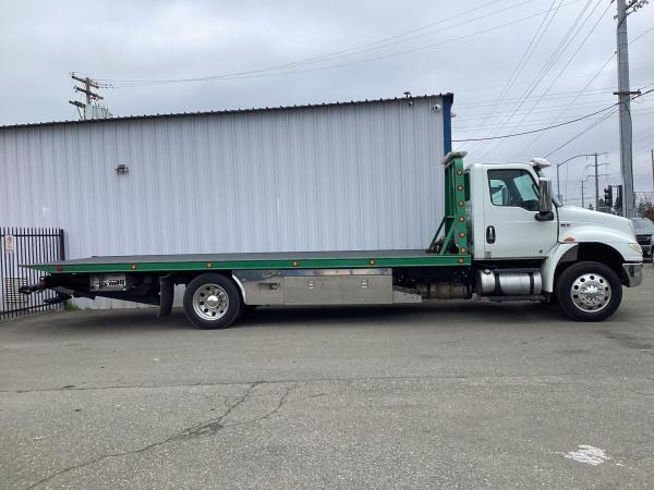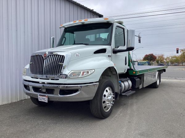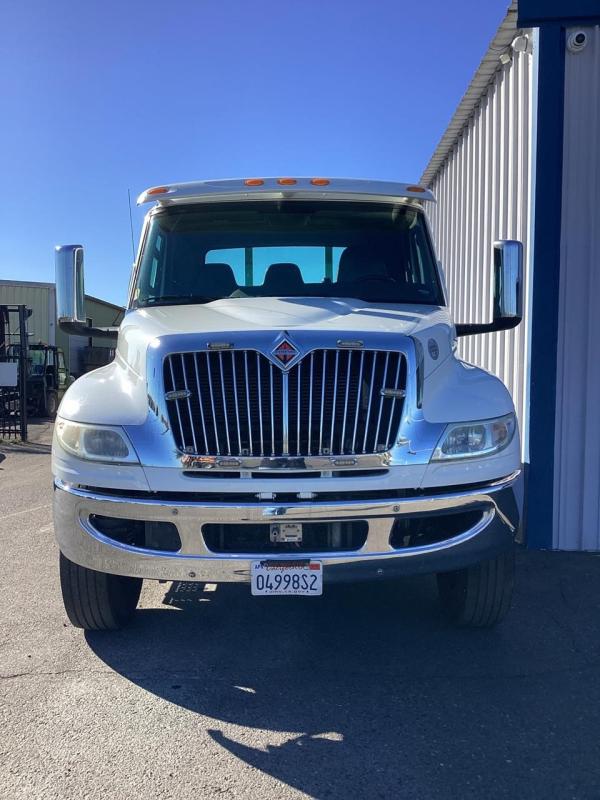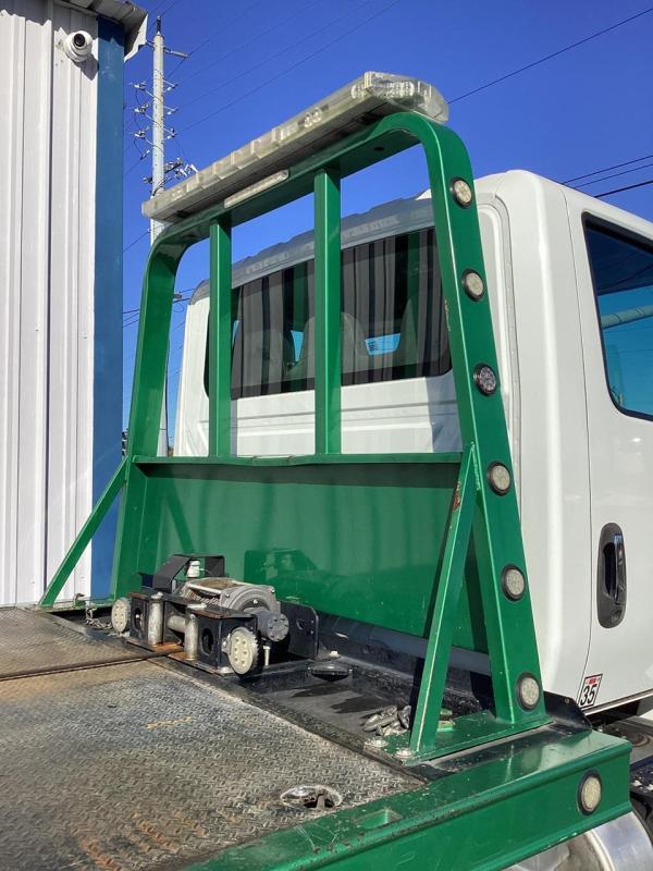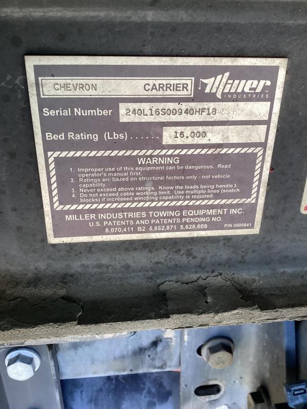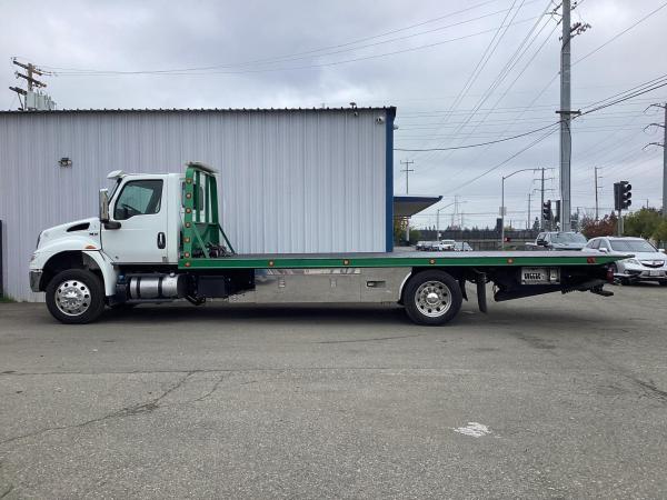 2019 Intl MV Day Cab w/ 6.7L Cummins, 325HP, 750lbs-ft, Allison RDS-3000 6 Speed Auto, Air Brakes, Exhaust Brake, Chrome Bumper and Grille, AM/FM/Bluetooth, Fog Lights, Dual Alum Fuel Tanks 0-40 gallons. , DEF Tank, Power Windows & Door Locks, Air Dryer with Heater. 10,000lb front suspension, 10,000lb Front axle. 23,000lb Rear axle, 23,000lb Air Ride suspension with Dump. 166"CA, RADIO AM/FM/WB/Clock/Bluetooth/USB Input/Auxiliary Input, MP3, Apple Device Play & Control. Tires. 3 Speakers. Electric Horn, Air Horn. 275/70R22.5 Tires w/ 22.5 Alum Wheels, block heater. Aux Switches, PTO Switch. Air-ride driver's seat, two-man passenger seat. Keyless entry, Visor,Air Ride cab mounts. 33,000lbs GVWR,24' Body length. - Chevron Steel LCG Series 16 (Low Center of Gravity) Carrier w/ Wheel Lift, 3/16 Deck Plate, 3x2 Corten Tube Crossmembers on 8 inch Centers, (4) Rear Chain Locks, (2) Front Chain Locks, (6) Floor Plate Chain Locks (3 per side), 8,000lb Worm Gear Winch, 3/8" x 50' Winch Cable, Illuminated Dual Controls, FMVSS 108 Lamp Group Shock Mounted Lighted, Direct Mount Pump, Cable Roller Guide w/ Tensioner, Winch Free Spool Extension, Back-Up Alarm, (2) Safety Chains, Mechanical Anti-tilt, Black Body Paint, 102" Wide Body, Inboard Tilt Cylinders, Floor Level Roll Formed w/ Punched Stake Pockets, 4,000lb Wheel Lift w/ Releasable L Arms, Fully Hydraulic Wheel Lift, (2) Safety Straps & Ratchets, (2) Rear Safety Chains, Body Lock w/ Nylatron Toller Bearings, & 16,000lb Deck Load Rating. Body SN 240L16S00940HF18