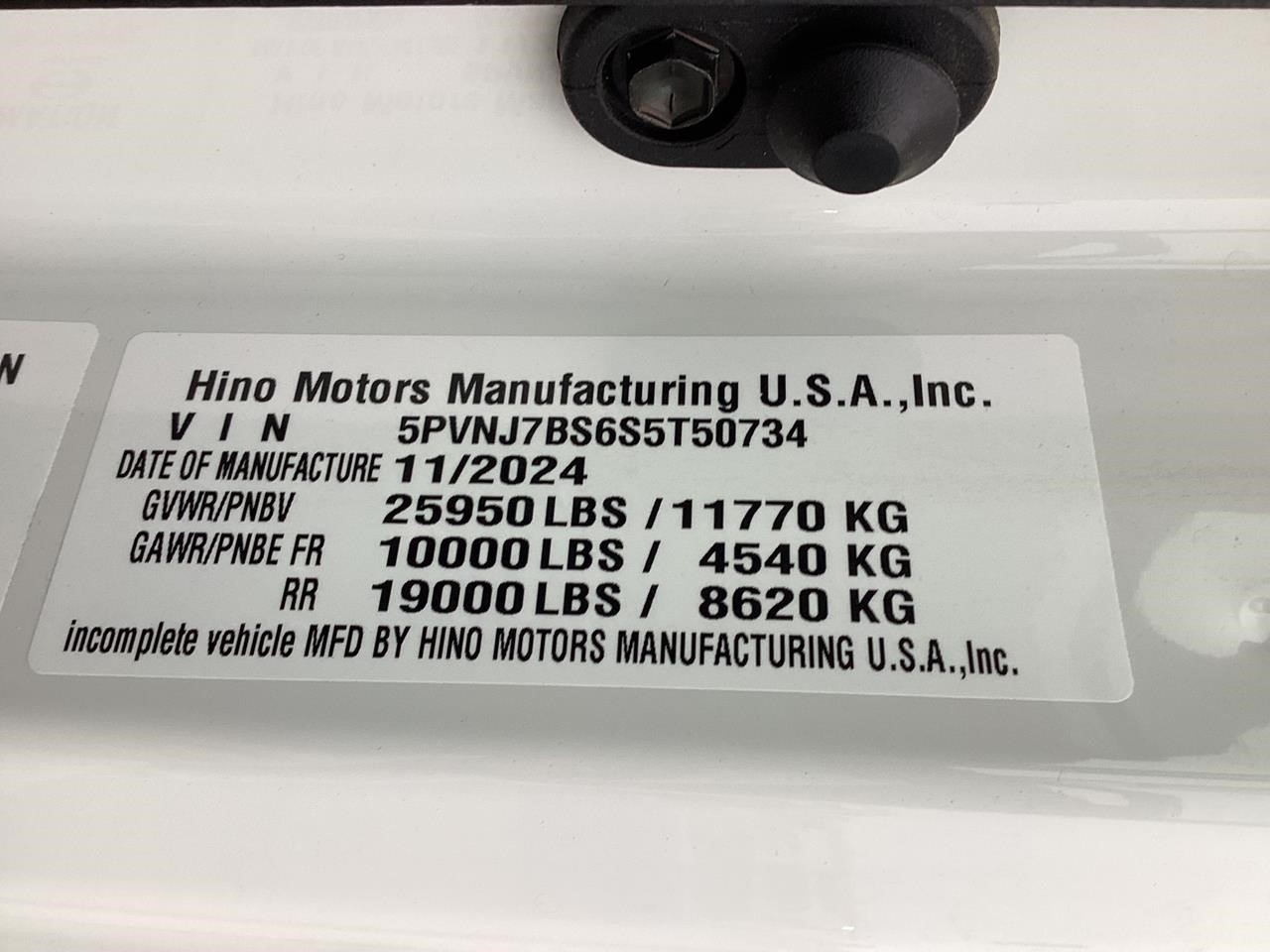 2025 Hino L-6 California Compliant - 260 HP Auto. Allison Automatic. Exhaust Brake, Air Brake package. 10,000lb front Axle 12K Front Suspension. 19,000lb Rear Axle, 5.13 Ratio. 52 52-gallon aluminum tank. 19,000lb Air suspension. Power Group, AM/FM Bluetooth.. Air ride driver seat. Single passenger seat. Rear Bench seat, cruise control, Idle up, chrome bumper -Aluminum wheels, Power Mirrors. Tilt wheel.. WB 22.5 25570R Tires. GVWR 25,950 149” CA ---- 5-year 300K Engine and After-treatment. 7-year unlimited -Allison Warranty-
