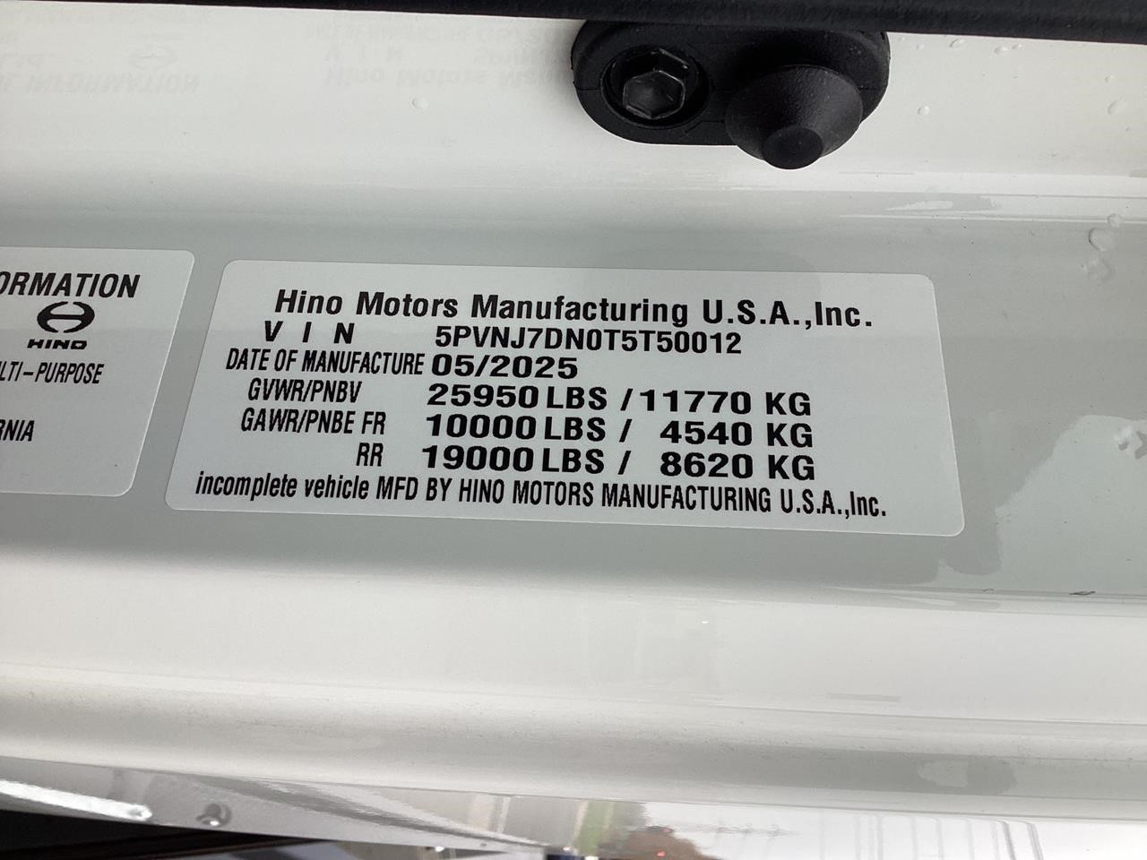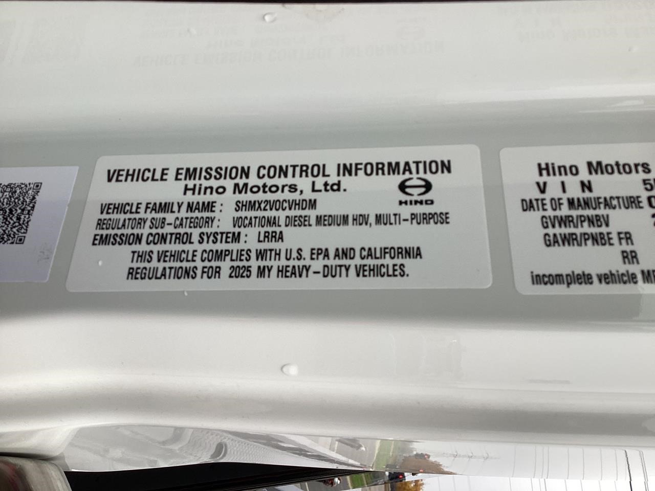 2026 Hino L-6 California Compliant - 260 HP Auto. Allison Automatic. Exhaust Brake, Air Brake package. 10,000lb front Axle 12K Front Suspension. 19,000lb Rear Axle, 4.88 Ratio. 52 52-gallon aluminum tank. 19,000lb Air suspension. Power Group, AM/FM Bluetooth, air-ride driver's seat. Two-man passenger seat. cruise control, Idle up, chrome bumper -Aluminum wheels, Power Mirrors. Tilt wheel.. WB 22.5 25570R Tires. GVWR 25,950 149” CA ---- 5-year 300K Engine and After-treatment. 7-year unlimited -Allison Warranty