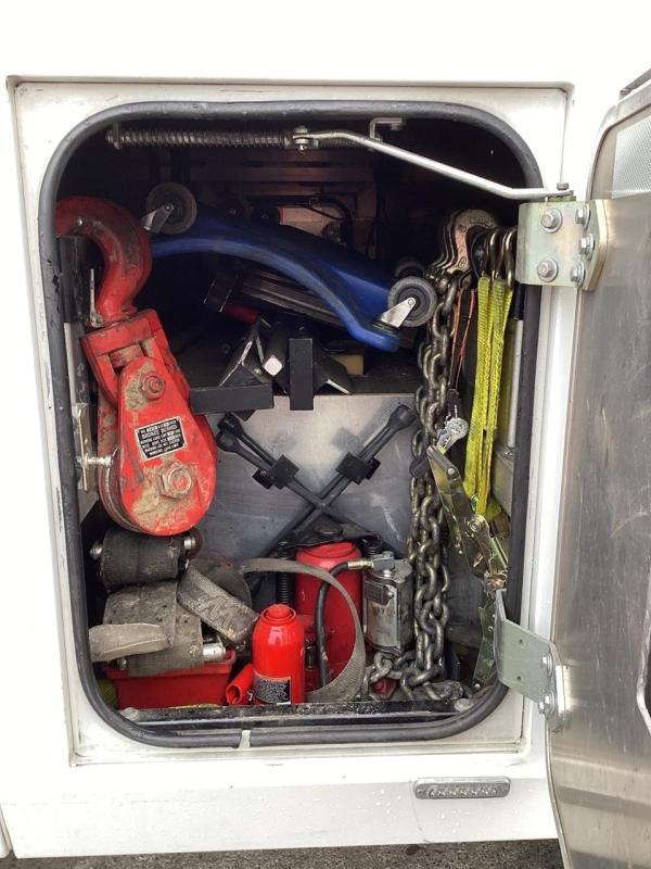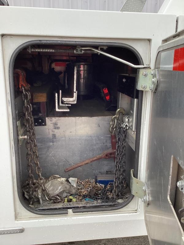 Chevron 1016 Model 16 ton Boom Dual 15K planetary Winches 1/2" x 150' cable per drum Cable tensioners (Installed) 12,500 Under lift Rating Retracted 87" Reach under lift to Centerline of Forks Aluminum Modular body sides Through box (Tunnel) aluminum Dual control Stations Tool compartment Closures on all Doors One pair of 3" Forks One pair of 4" Forks Spring fork adapters Low Profile offset fork holders Under lift Crossbar Extensions Elevated Fork holders.Releasable "L" Arms - Recessed in body Wheelift Strap and Ratchets Safety Chain pockets Safety Chains FMVS -108 lighting Rear "D" Rings Lubrication Fittings on all Pivot points Backup alarm 96" Body Width Boom. Body Serial # 10114653