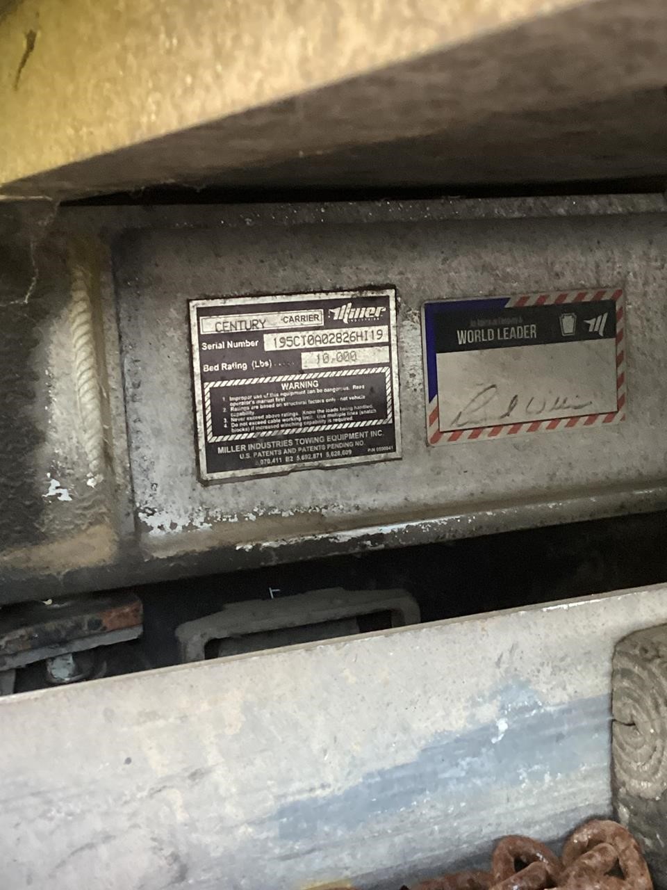 Century 19.6" Aluminum Floor Rails (Aluminum) 4 Key Slot Package (Aluminum) 210" Full-Length Subframe Full-Length Slide Pads Right & Left Chain Trays Bed Anti-Tilt Lockout. Safety Chains (2-front, 2-rear) Positive Lock-down Painted with Black Acrylic Enamel (Subframe). Two Lift Cylinders Left & Right Side Illuminated Controls One Extension Cylinder, Federal Standard #108 LED Lighting Winch Clutch Release 8,000 lb. Hydraulic Winch w/50' Cable Cable Tensioner Full Function Wheel Lift System Cable Roller Guide Slide-In L-Arms with Anti-Theft Storage Tow Light Socket. Pre-Wired Electrical Junction Box Mud Flaps, Back-Up Lights & Alarm, Hydraulic Pump. Adjustable Rear Stabilizer. LED Light package included. Body SERIAL# 195CT0A02826H19