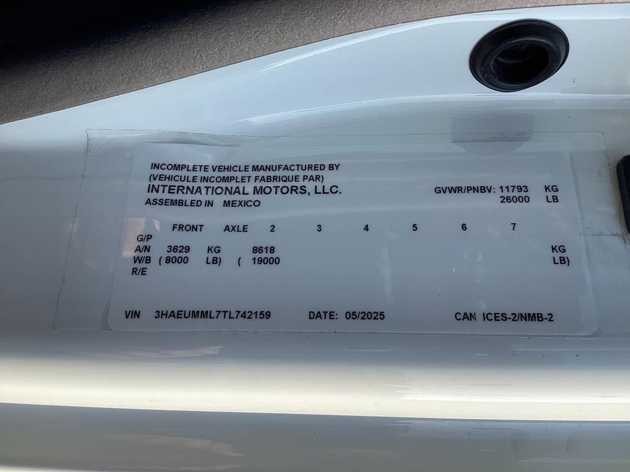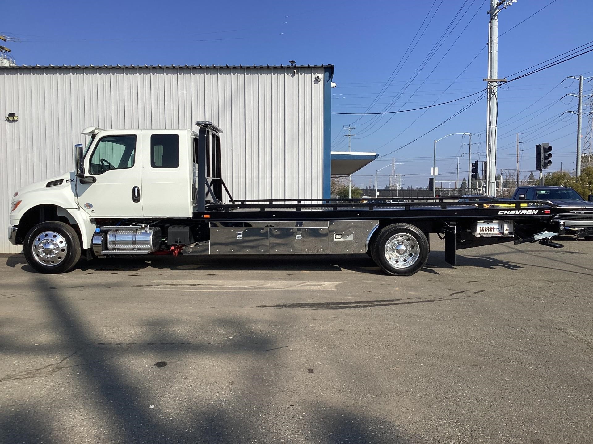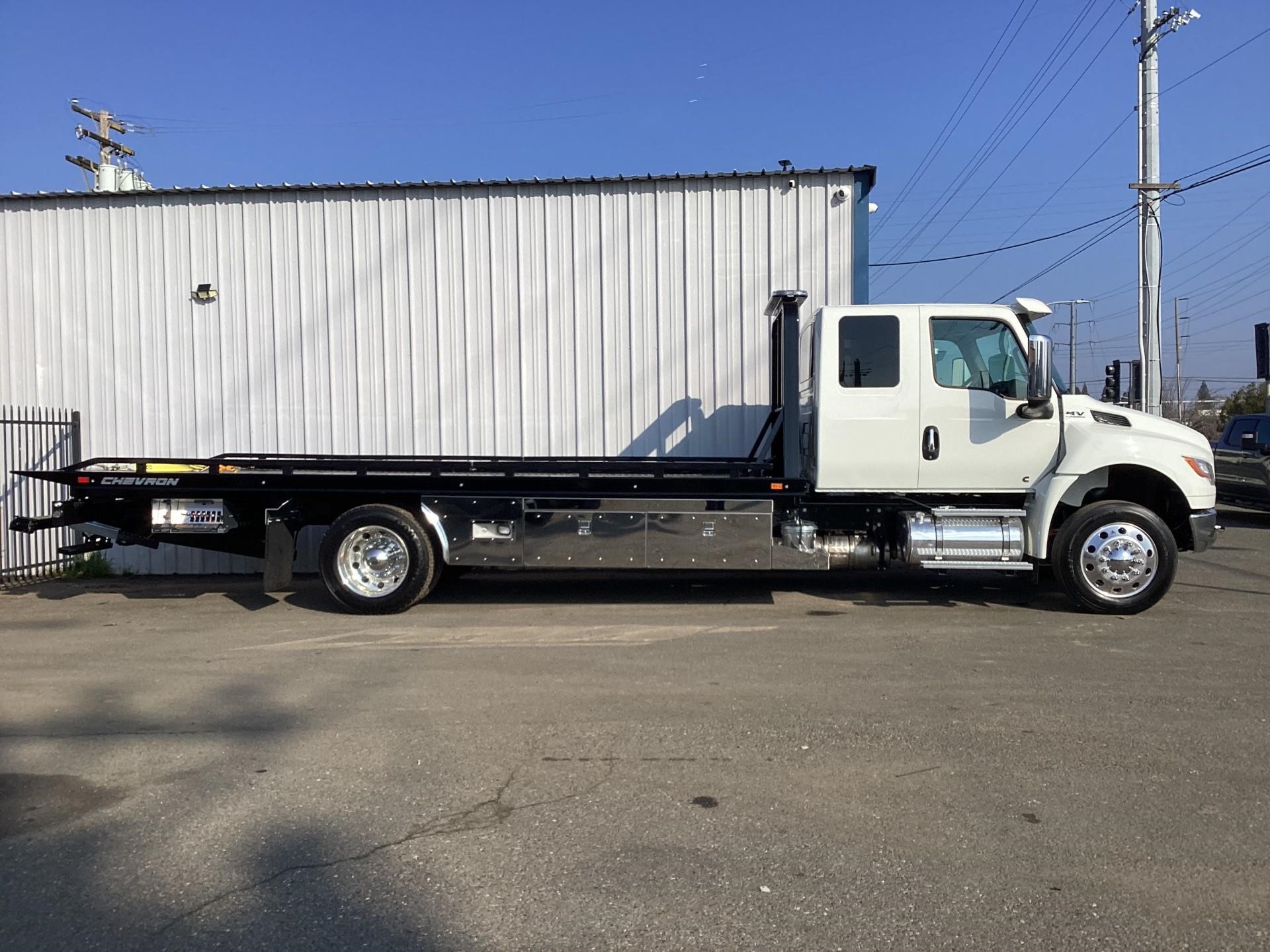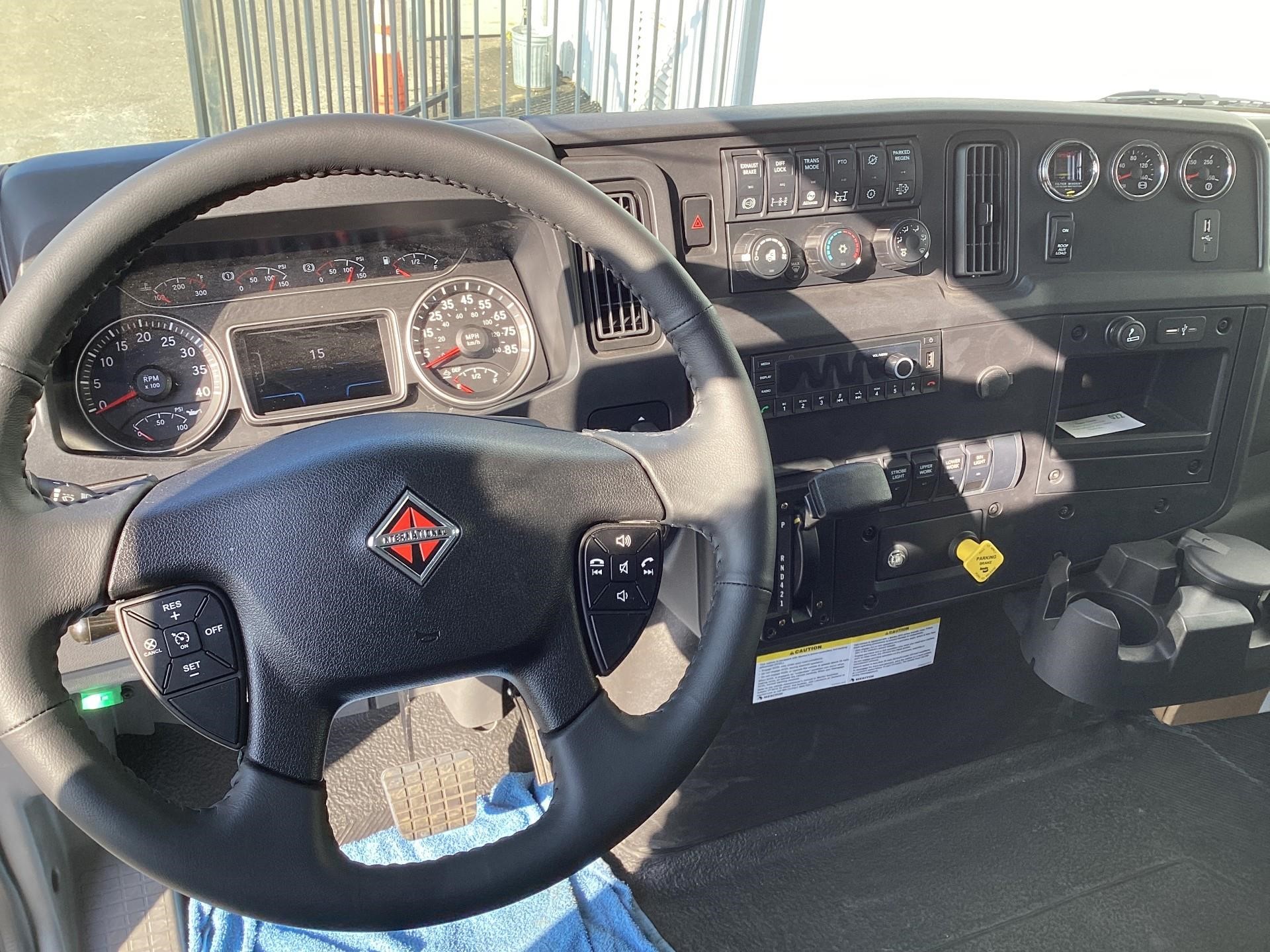 International Model MV Extended cab. Cummins ISB 6.7L, 300HP @ 2,300 rpm, 660 lb-ft @ 1,600 rpm, Allison RDS-2200 6 Speed Auto, Air Brakes, Air Dryer Heater, Exhaust Brake, Front Axle: Dana-Spicer I-Beam 8,000lb w/ Shock Absorbers, Rear Axle: Dana-Spicer 19,000lb rear differential lock. , 20,000lb Air Ride Suspension, 4.88 Rear Axle Ratio, Chrome Bumper, black Grille, Air Ride Driver Seat,& Passenger Seat, rear bench seat. Idle Up, Cruise Control, Tilt-Wheel, AM/FM/CD/MP3 w/ Bluetooth, Air Horn, Engine Block Heater, Dual 40-50 Gal Alum Fuel Tanks, 7 Gal DEF Tank, Power Windows, Power Door Locks, Power heated Mirrors. A/C, 255/70R22.5 Tires w/ 22.5 Alum Wheels, Cup holders.Visor 25,500 GVWR,