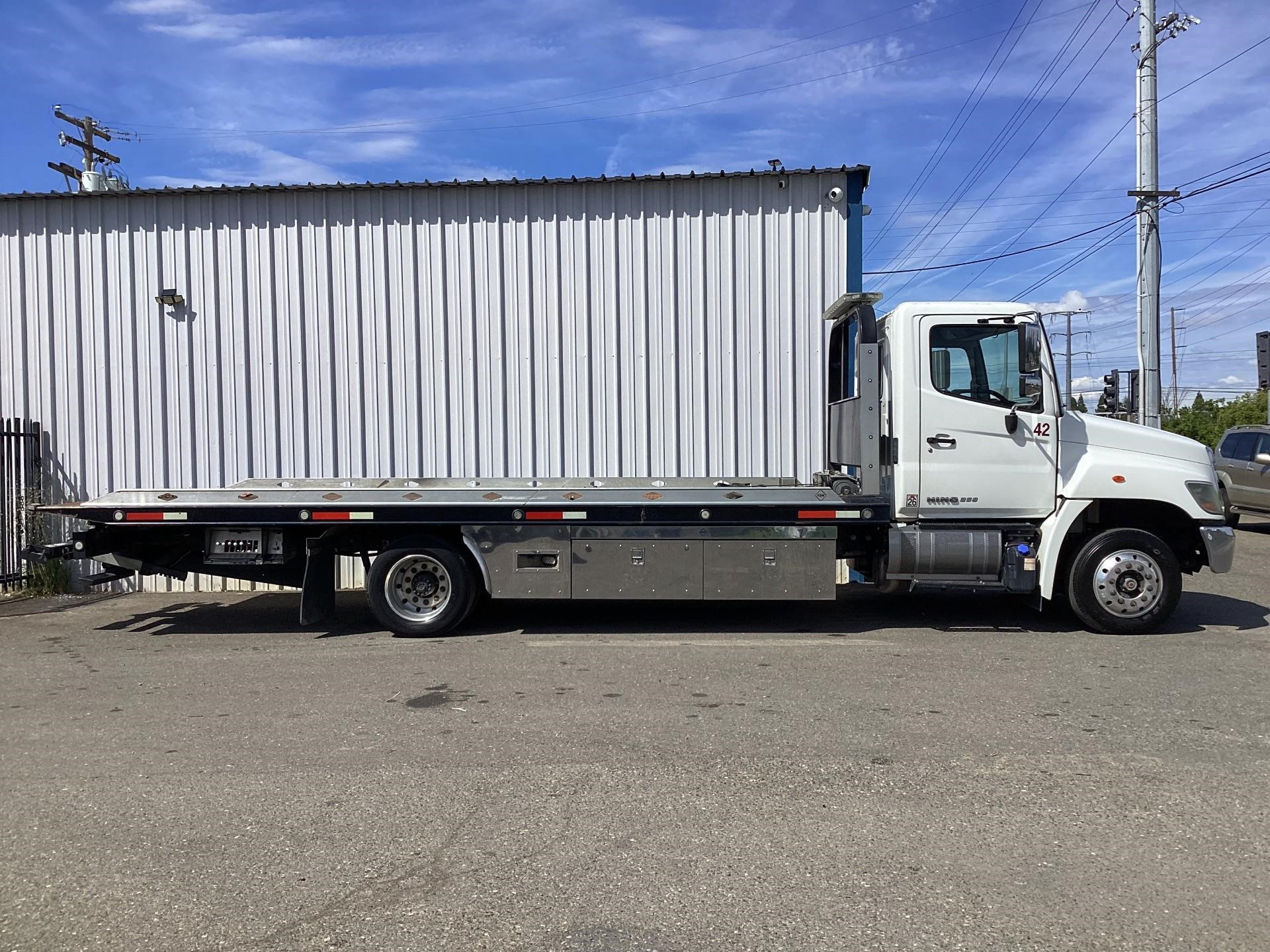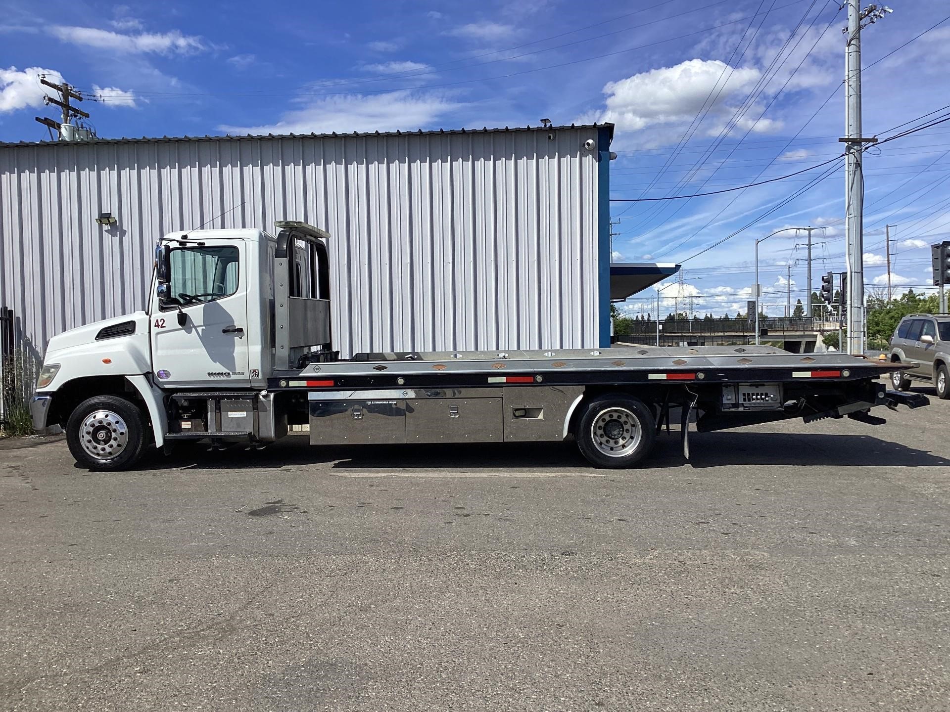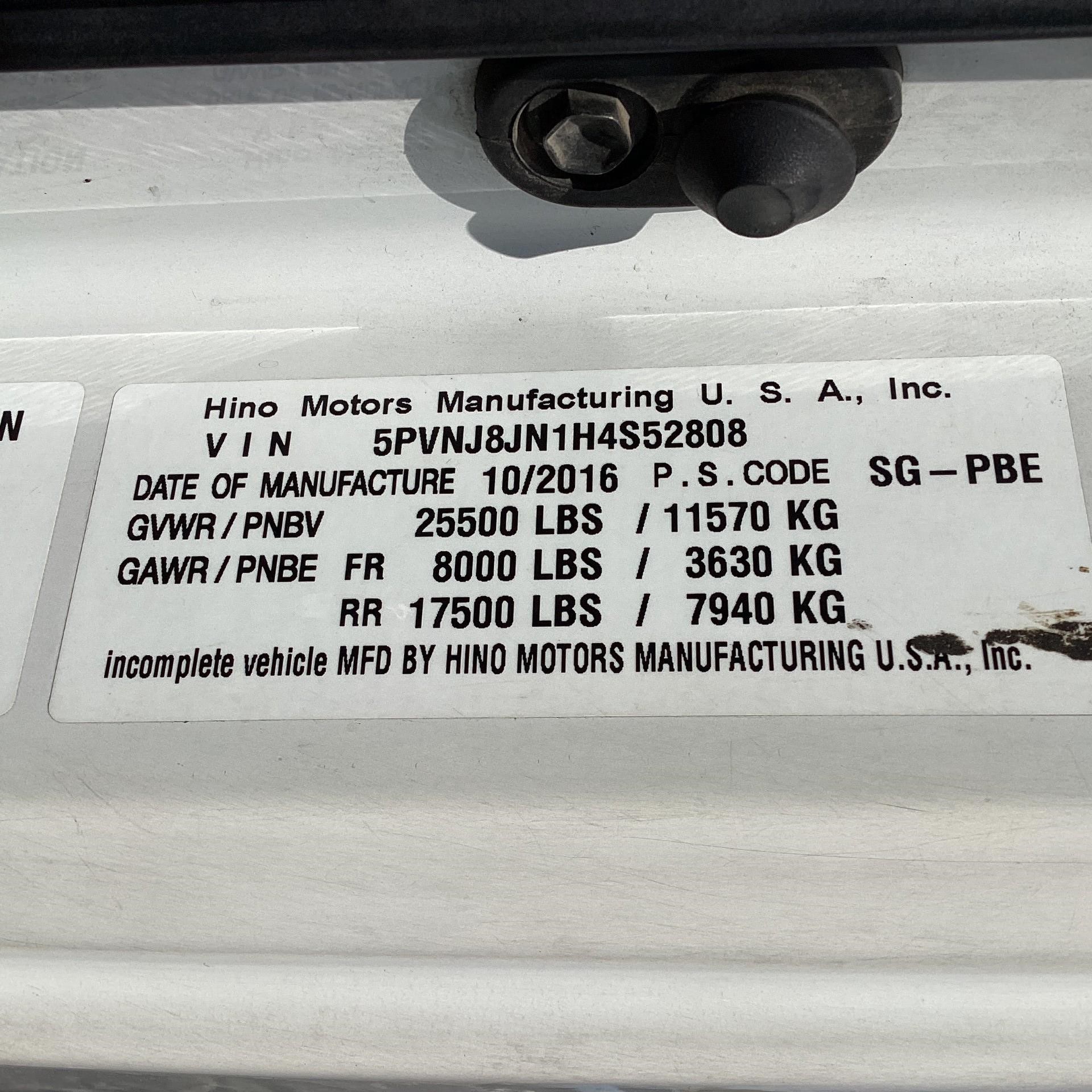 Hino Model 258 260HP J08E-AT 6 Cylinder turbo Diesel 660lbs torque. Allison 2500 RDS Transmission. Power Windows. Power locks. Cruise Control. AM/FM CD player, 19.5 245/70R tires. Tilt Telescoping steering wheel. Suspension seat Driver ( Two-man passenger Air Brake package. Chrome Grille. Chrome Mirrors- Heated Mirrors. Power windows. Power locks. Chrome bumper. Exhaust brake. Heated mirrors. 52-gallon Aluminum fuel tank. 8,000lb front axle. 17,500lb Rear Axle. 4.11 Rear End Ratio. 19,000lb Hendrickson Air Suspension w/dump valve. Daytime Running lights. Block heater, Aluminum wheels. 19.5 x 7.25. .. EPA 10 Compliant SCR. Cold weather package. Driver Information Display LCD. GVWR 25,500. Connected Vehicle, Telematics,