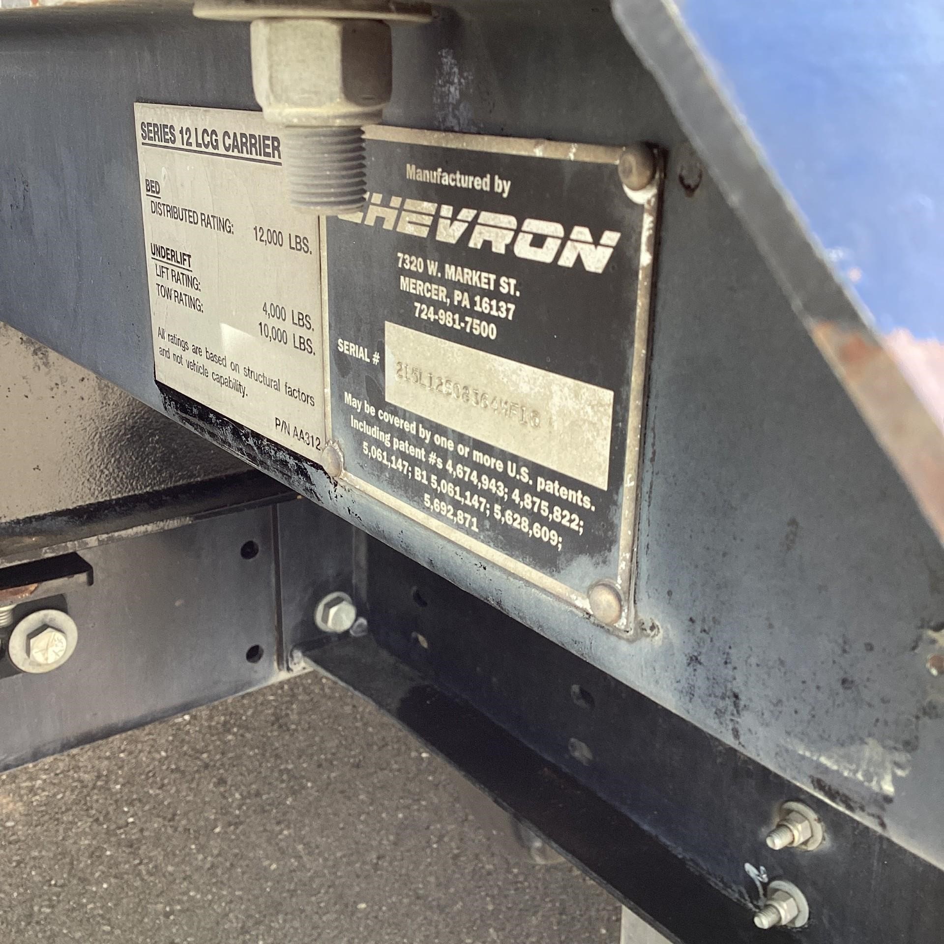 Chevron 21.5' Steel LCG (Low Center of Gravity) Carrier w/ Wheel Lift, 3/16 Deck Plate, 3x2 Corten Tube Crossmembers on 8 inch Centers, (4) Rear Chain Locks, (2) Front Chain Locks, (6) Floor Plate Chain Locks (3 per side), 8,000lb Worm Gear Winch, 3/8" x 50' Winch Cable, Illuminated Dual Controls, FMVSS 108 Lamp Group Shock Mounted Lighted, Direct Mount Pump, Cable Roller Guide w/ Tensioner, Winch Free Spool Extension, Back-Up Alarm, (2) Safety Chains, Mechanical Anti-tilt, Black Body Paint, 102" Wide Body, Inboard Tilt Cylinders, Floor Level Roll Formed w/ Punched Stake Pockets, 4,000lb Wheel Lift w/ Releasable L Arms, Fully Hydraulic Wheel Lift, (2) Safety Straps & Ratchets, (2) Rear Safety Chains, Body Lock w/ Nylatron Toller Bearings, & 12,000lb Deck Load Rating. Serial # 215L2S08364MF16