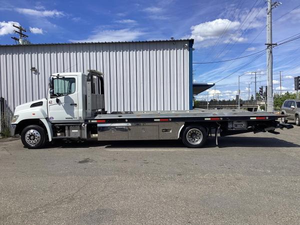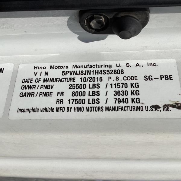 Hino Model 258 260HP J08E-AT 6 Cylinder turbo Diesel 660lbs torque. Allison 2500 RDS Transmission. Power Windows. Power locks. Cruise Control. AM/FM CD player, 19.5 245/70R tires. Tilt Telescoping steering wheel. Suspension seat Driver ( Two-man passenger Air Brake package. Chrome Grille. Chrome Mirrors- Heated Mirrors. Power windows. Power locks. Chrome bumper. Exhaust brake. Heated mirrors. 52-gallon Aluminum fuel tank. 8,000lb front axle. 17,500lb Rear Axle. 4.11 Rear End Ratio. 19,000lb Hendrickson Air Suspension w/dump valve. Daytime Running lights. Block heater, Aluminum wheels. 19.5 x 7.25. .. EPA 10 Compliant SCR. Cold weather package. Driver Information Display LCD. GVWR 25,500. Connected Vehicle, Telematics,Inspection notes: Front tires 12/32 12/32 Rear Tires 6/32 5/32 4/32 5/32 Brakes 20% .Driver seat Ripped-
